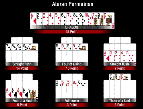 - 2,3,4,5,6,7,8,9,10,J,Q,K,A disebut Dragon angka terbesar dalam permainan Capsa Susun
